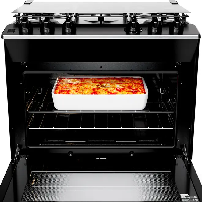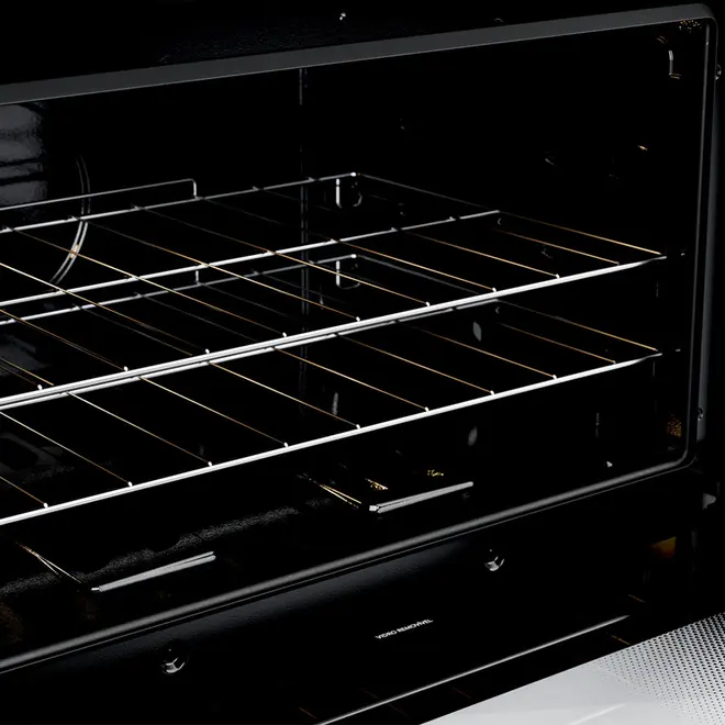 O Brastemp BFS5NDB combina alta tecnologia e design inteligente para transformar sua rotina na cozinha. Com 5 bocas de alta potência, incluindo 3 queimadores rápidos, e um forno ergonômico de 96 litros, além de duas prateleiras ajustáveis e visão panorâmica com luz interna, permitindo acompanhar seus pratos sem abrir a porta, oferece a agilidade e o espaço necessários para suas receitas. O modelo se destaca pela praticidade e durabilidade: possui mesa em inox, trempes robustas e puxador em alumínio escovado. Para facilitar a limpeza, conta com a tecnologia Cleartec (revestimento esmaltado), botões removíveis e vidro interno da porta removível.