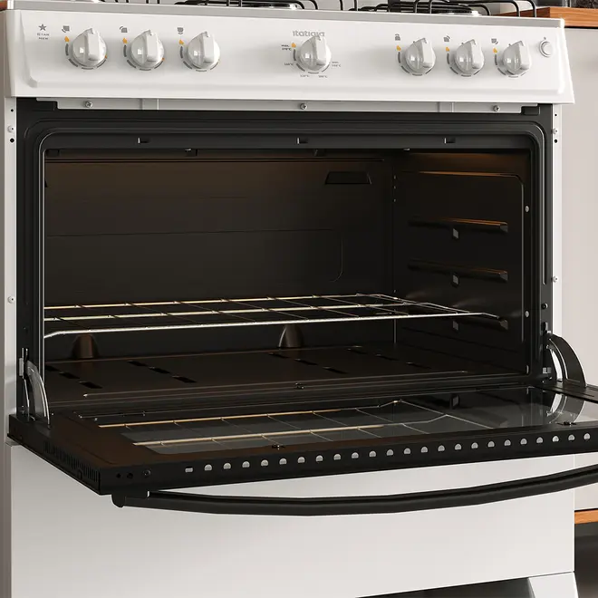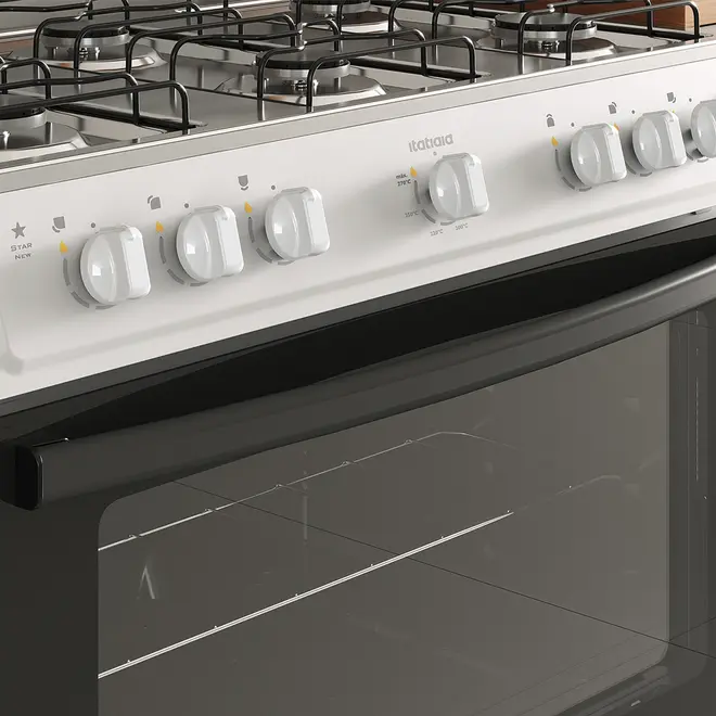 O Fogão 6 Bocas Star New Branco da Itatiaia é a escolha ideal para quem busca potência, eficiência e design moderno. Com instalação de piso, acendimento automático e controle integrado no painel, oferece praticidade no dia a dia. Sua mesa em aço inox 430 com acabamento polido garante durabilidade e sofisticação. Compatível com gás GLP e conversível para GN pelo Serviço Autorizado, entrega potência total de 13,2 kW para alto desempenho culinário. Com forno de 82 litros, potência de 2,4 kW e classificação energética A, proporciona economia e excelente performance em diferentes temperaturas de 180ºC a 270ºC, é perfeito para qualquer cozinha.