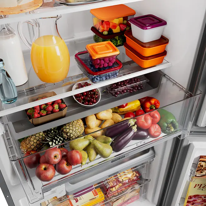 Tipos de Gavetas: Gaveta de Legumes, Turbo Zone, Gaveta do Freezer Superior e Gaveta do Freezer Inferior