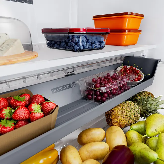 Gavetas e Prateleiras Removíveis: Gaveta de Legumes, Gaveta Freezer Superior, Gaveta Freezer Inferior, Cesto Delicates, Prateleiras da Porta, Infinity Shelf