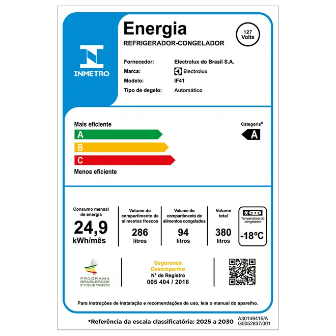 Gás Refrigerante: R600a (ecológico, não agride a camada de ozônio.)